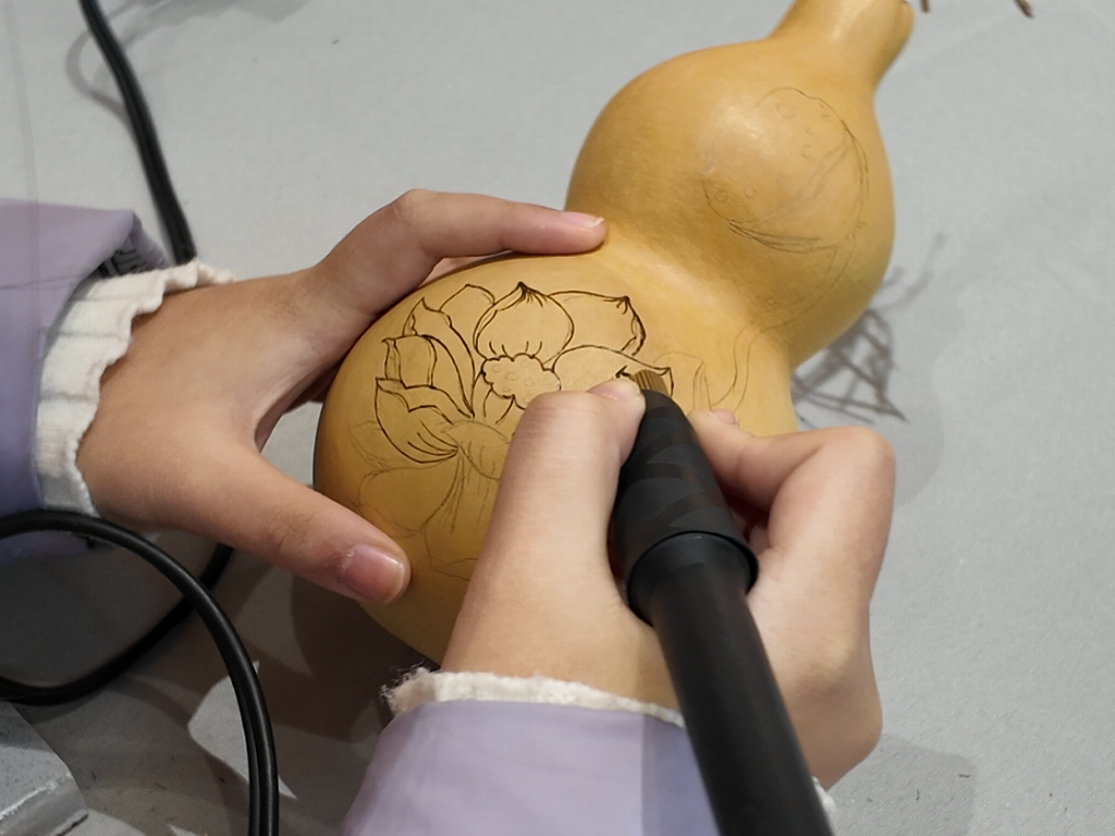 为让传统文化真正可感可触、入脑入心,团队开展了非遗葫芦烙画体验活动。作为运河沿岸流传已久的民间传统技艺,葫芦烙画以烙铁为笔、以葫芦为纸,将吉祥文化、民俗风情与运河生活图景融于作品之中。