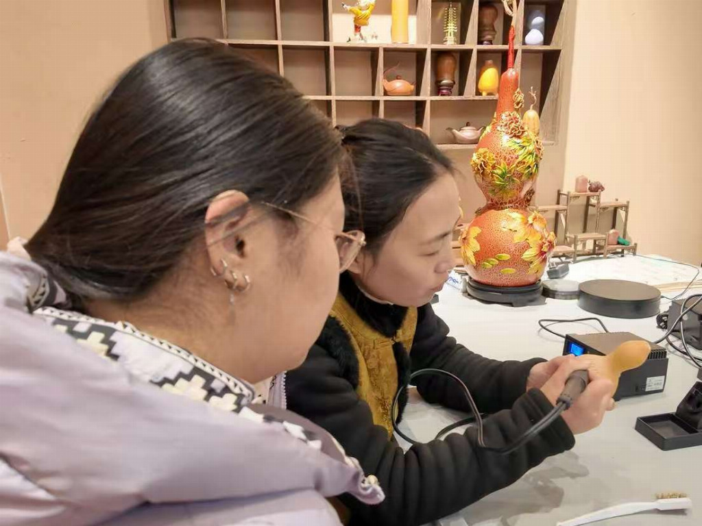 (图为团队成员体验葫芦烙画记录图 李星竹供图)